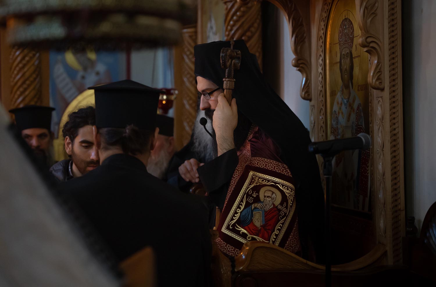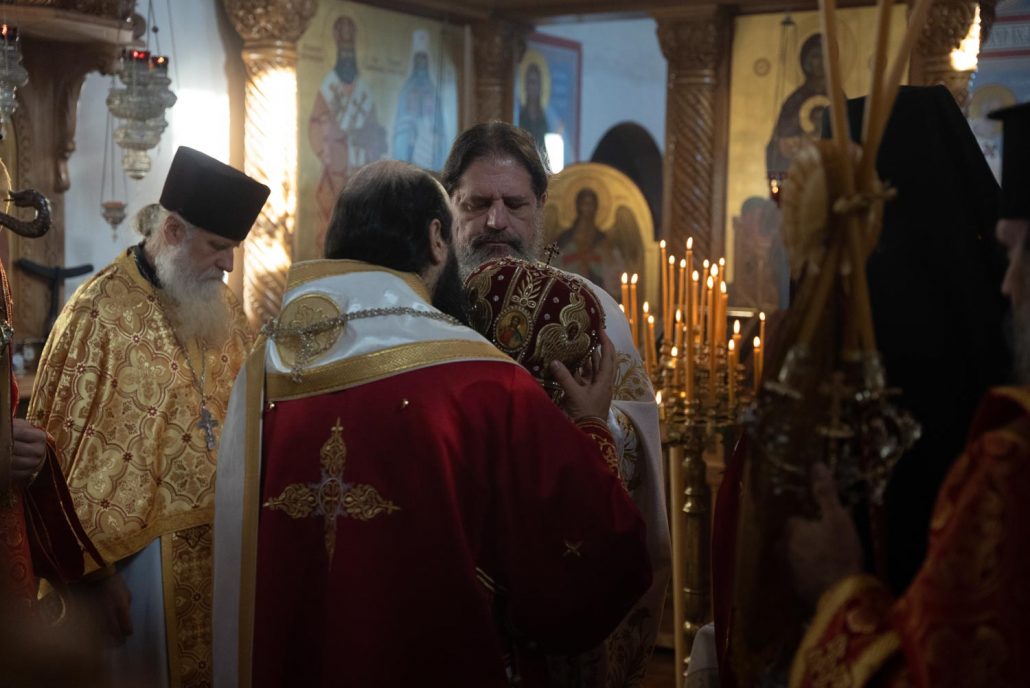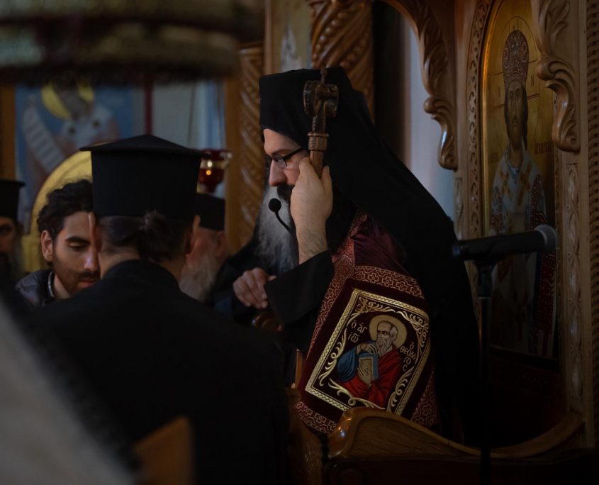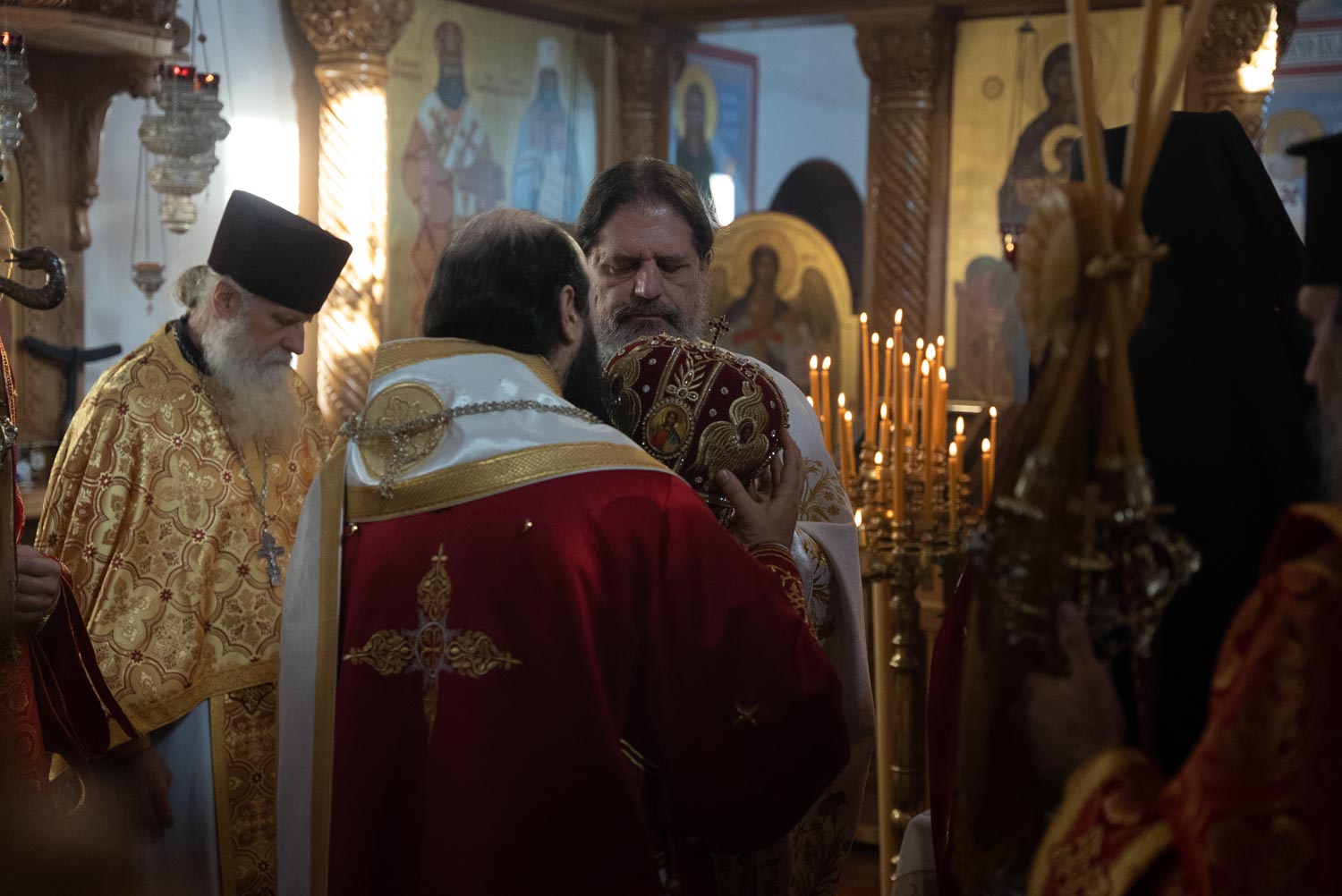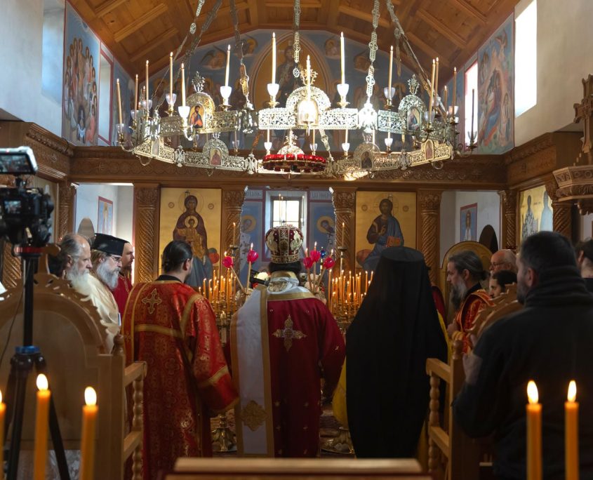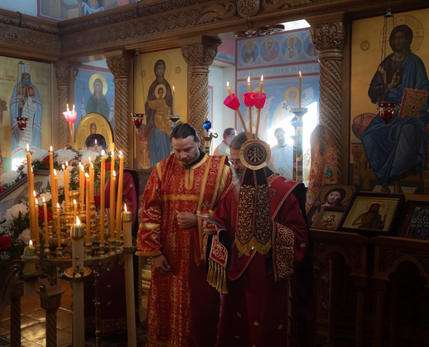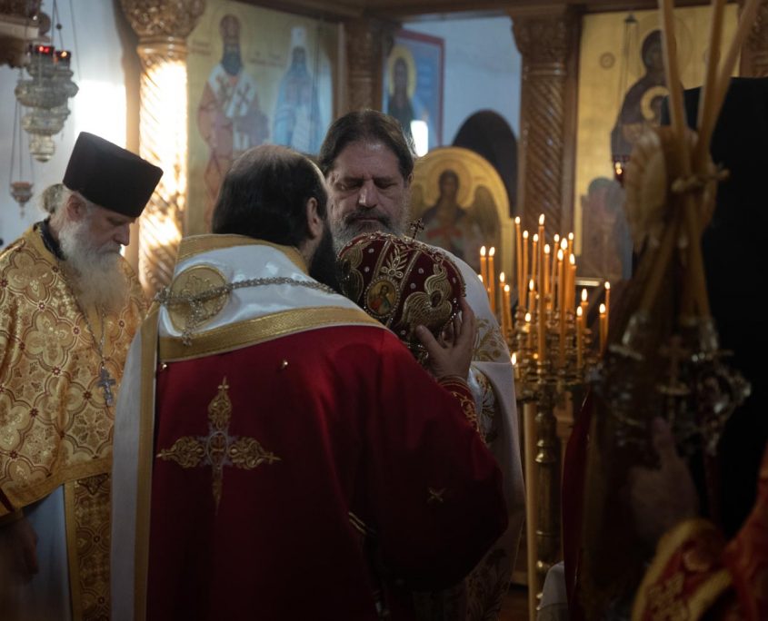 In the morning of the next day, a festive Hierarchical Liturgy was served by His Eminence, together with His Grace Bishop Christodoulos, and clergy of the Metropolis and Monastery. A festive meal was celebrated thereafter. After the meal, the traditional “Panagia” service was held in the trapeza. From there, the faithful processed back to the main Church of the Monastery, to complete the services of the day with the canon to St. Demetrius and the “polychronio” to His Eminence, according to the tradition of the Holy Mountain of Athos.